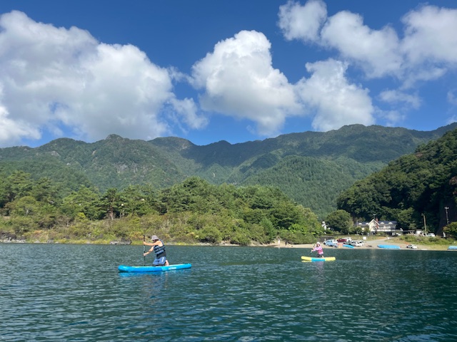 幸運にも天気が良かったので湖面に空や山が映り込んでとても綺麗です。まさに「サップ日和!」でした。最初はパドルの漕ぎ方が上手くいかず思ったように前に進みませんでしたが、次第に慣れてくると自分の思った方向に進めるようになり、周りの景色を見る余裕も出てきます。インストラクターさんから最初の目的地を示された時は「あんな遠い所まで行くの?」と思いましたが、あっという間に対岸のポイントに到着しました。この後いよいよ「スタンダップ(立った状態)」にチャレンジです!